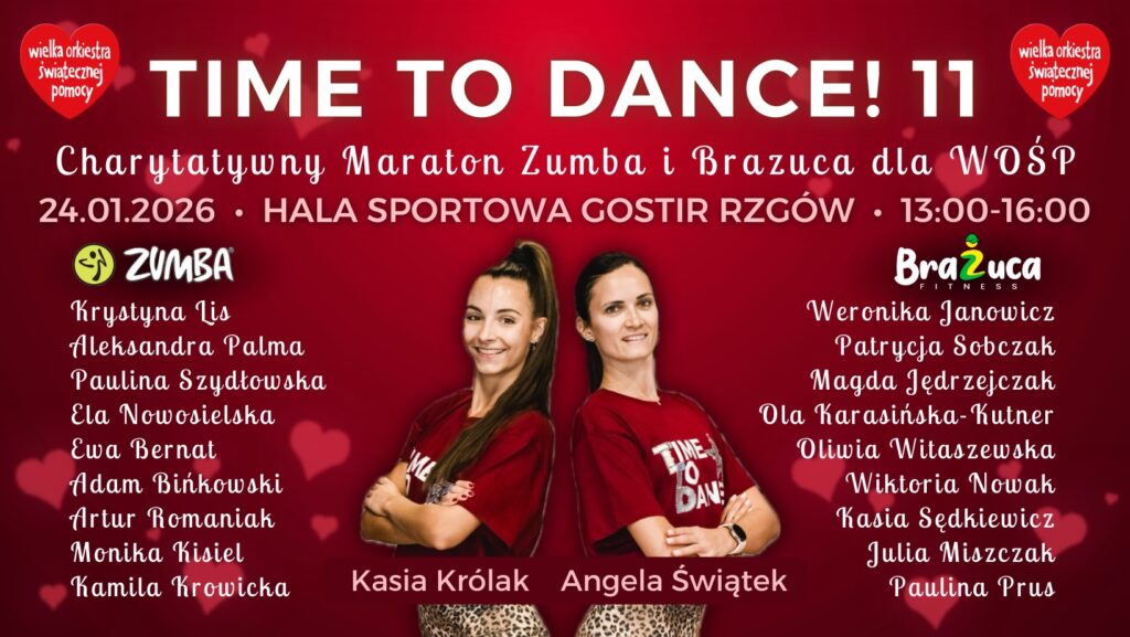 Jest nam niezmiernie miło zaprosić Was na kolejną charytatywną edycję naszego wydarzenia TIME TO DANCE! Już po raz trzeci zatańczymy dla Wielkiej Orkiestry Świątecznej Pomocy To będą 3h pełne pozytywnej energii i z mnóstwem spalonych kalorii!